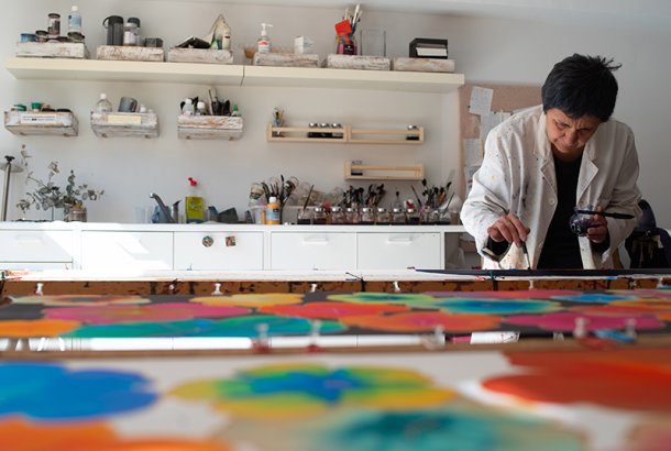 Sóc artista tèxtil i Mestra artesana, especialitzada en complements de seda natural pintats a mà, com fulards, xals i ventalls entre d’altres obres artístiques.